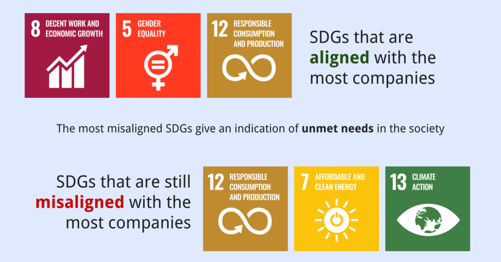 A final thought from the Webinar was a reason for investors to care about SDG alignment. An overview of how many companies are aligned or not highlights the major unmet needs in the society. There is the biggest potential for growth – misaligned or unaligned SDGs. Therefore investing in companies that directly align with these goals have a high potential for growth.