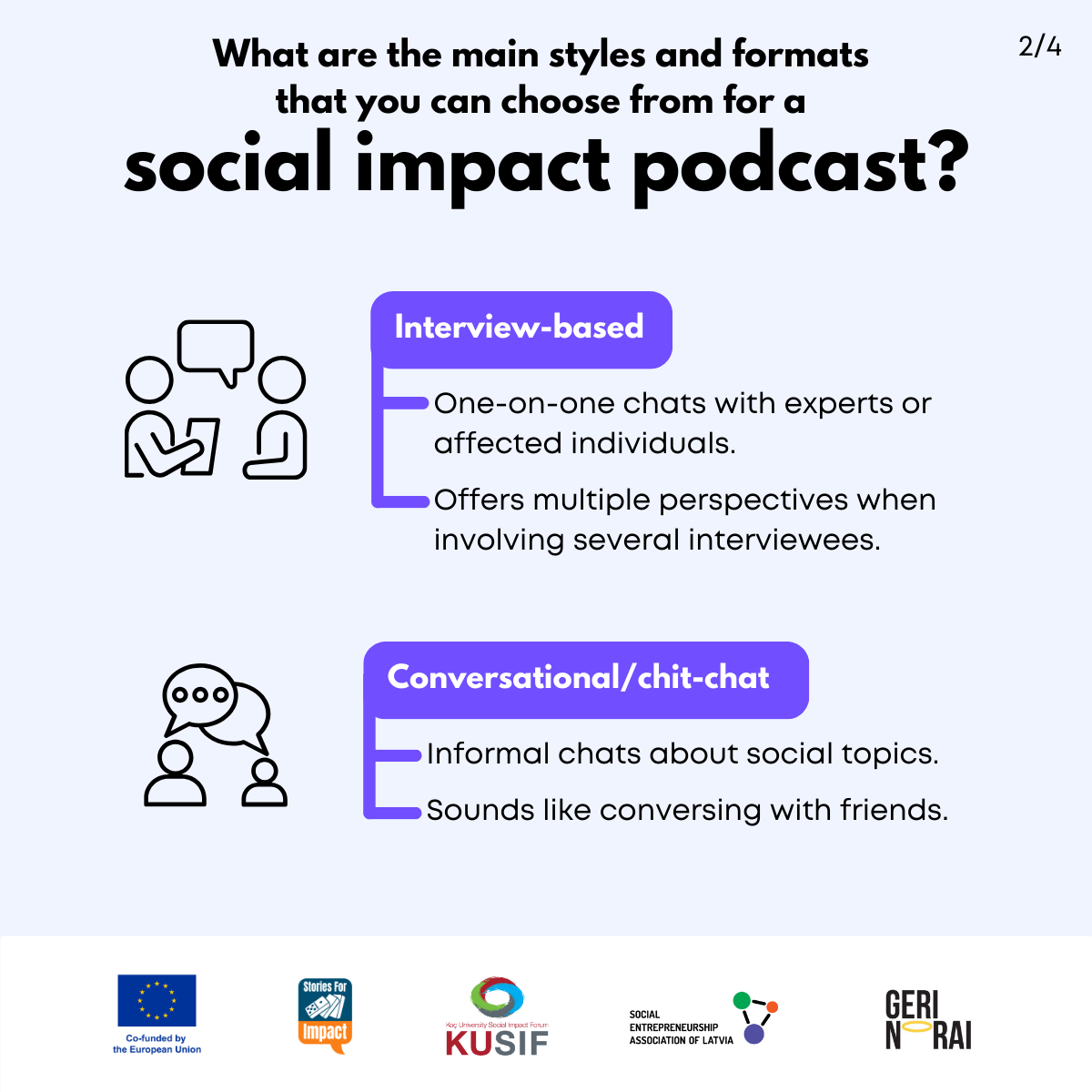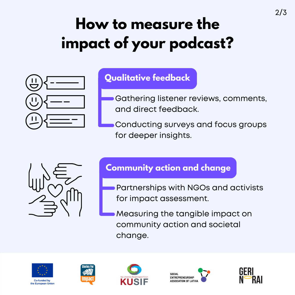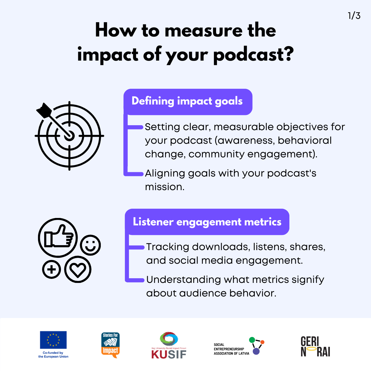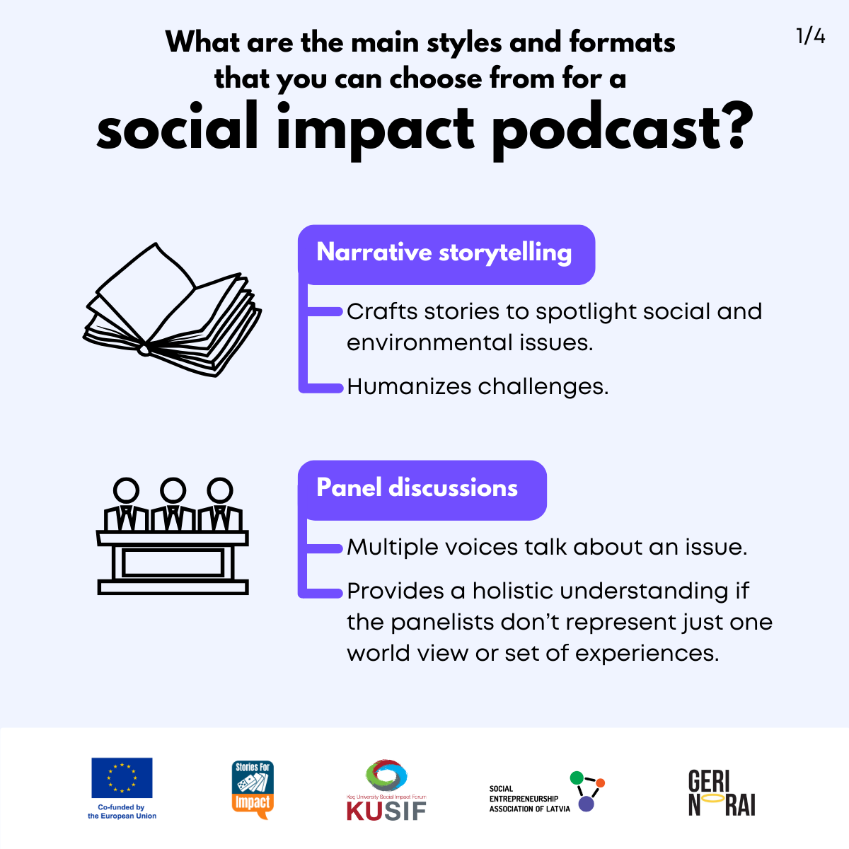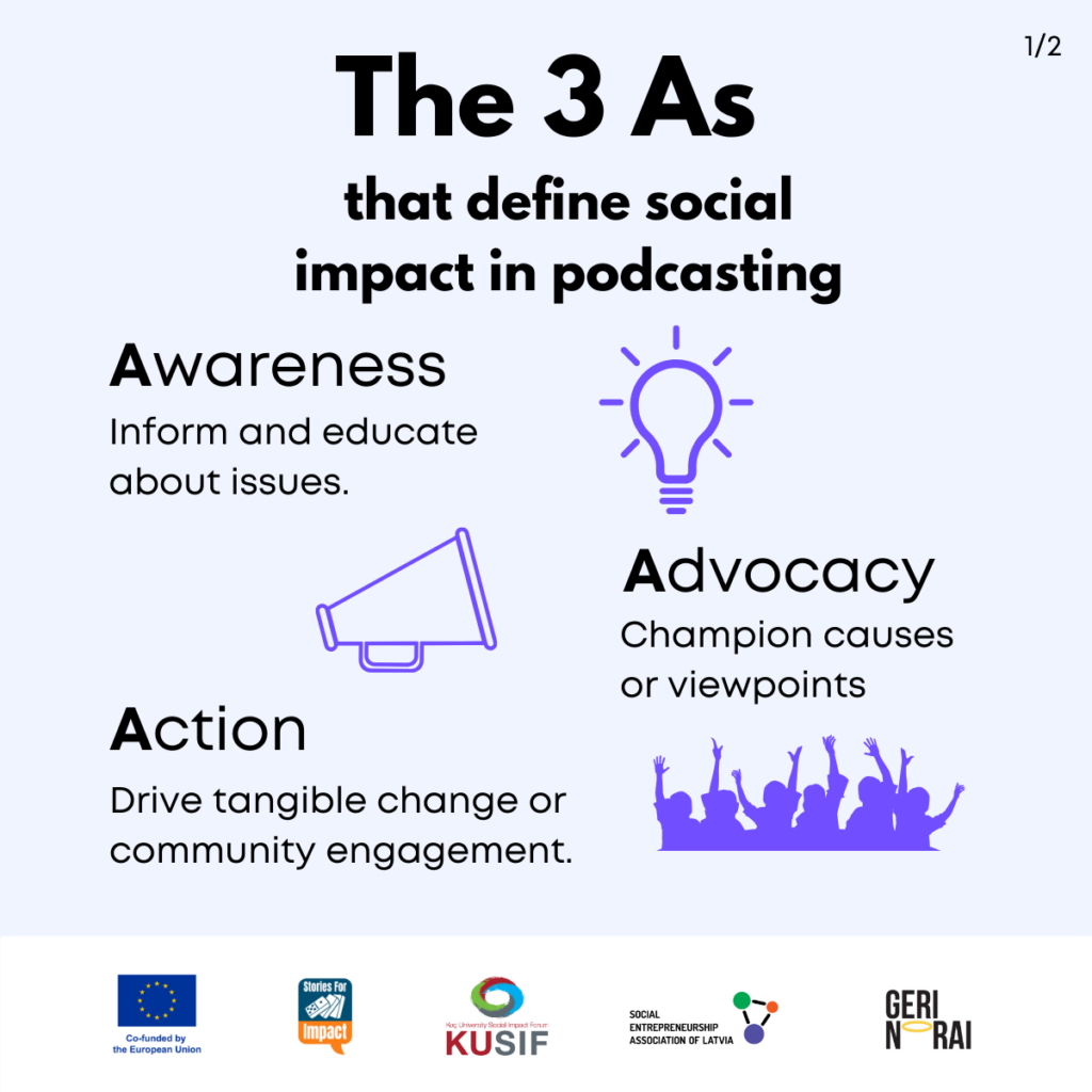 Here, we have created several visual materials with information you can use to start your own social impact podcast. You can study them and write down your thoughts, plans, etc., but to get the most out of it, we recommend you discuss them with a friend or a colleague and create at least one actionable item per studied material, as well as set a time when you’re going to execute it.