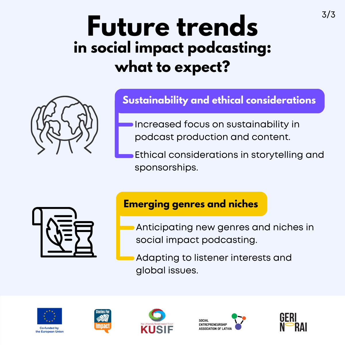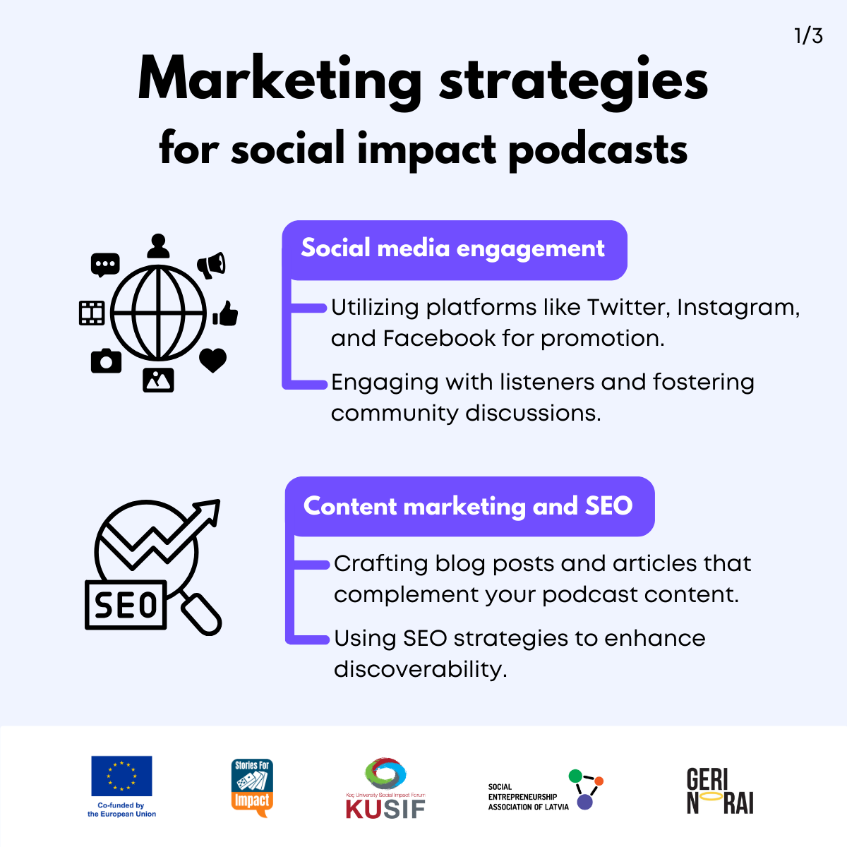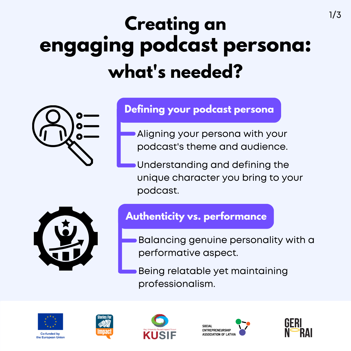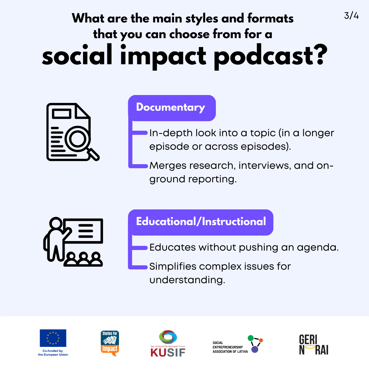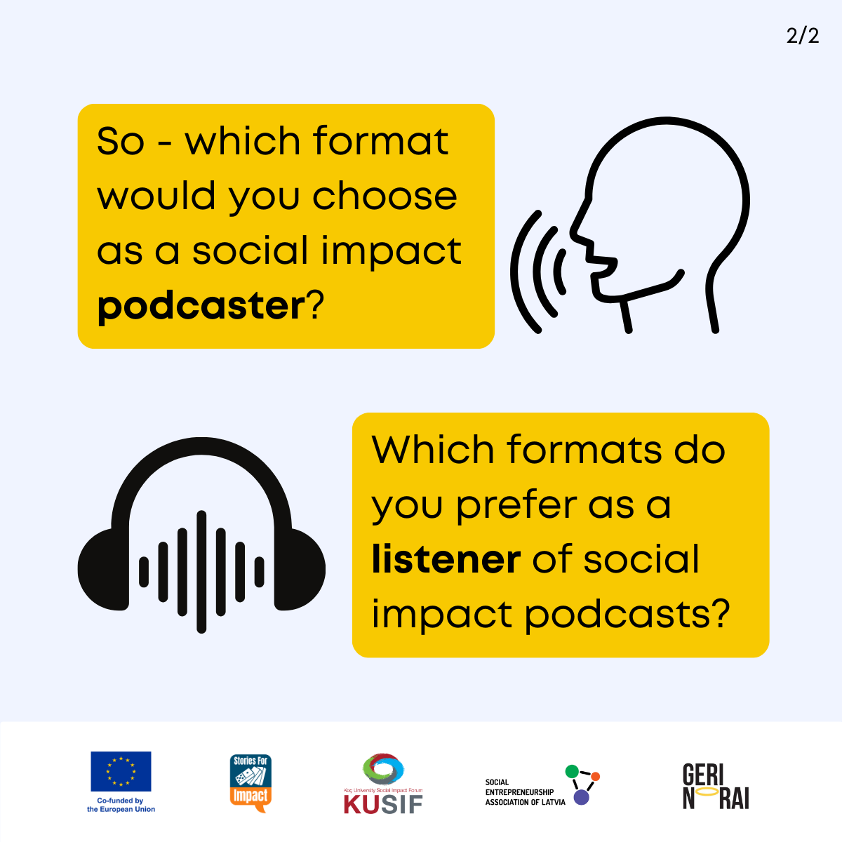 Here, we have created several visual materials with information you can use to start your own social impact podcast. You can study them and write down your thoughts, plans, etc., but to get the most out of it, we recommend you discuss them with a friend or a colleague and create at least one actionable item per studied material, as well as set a time when you’re going to execute it.