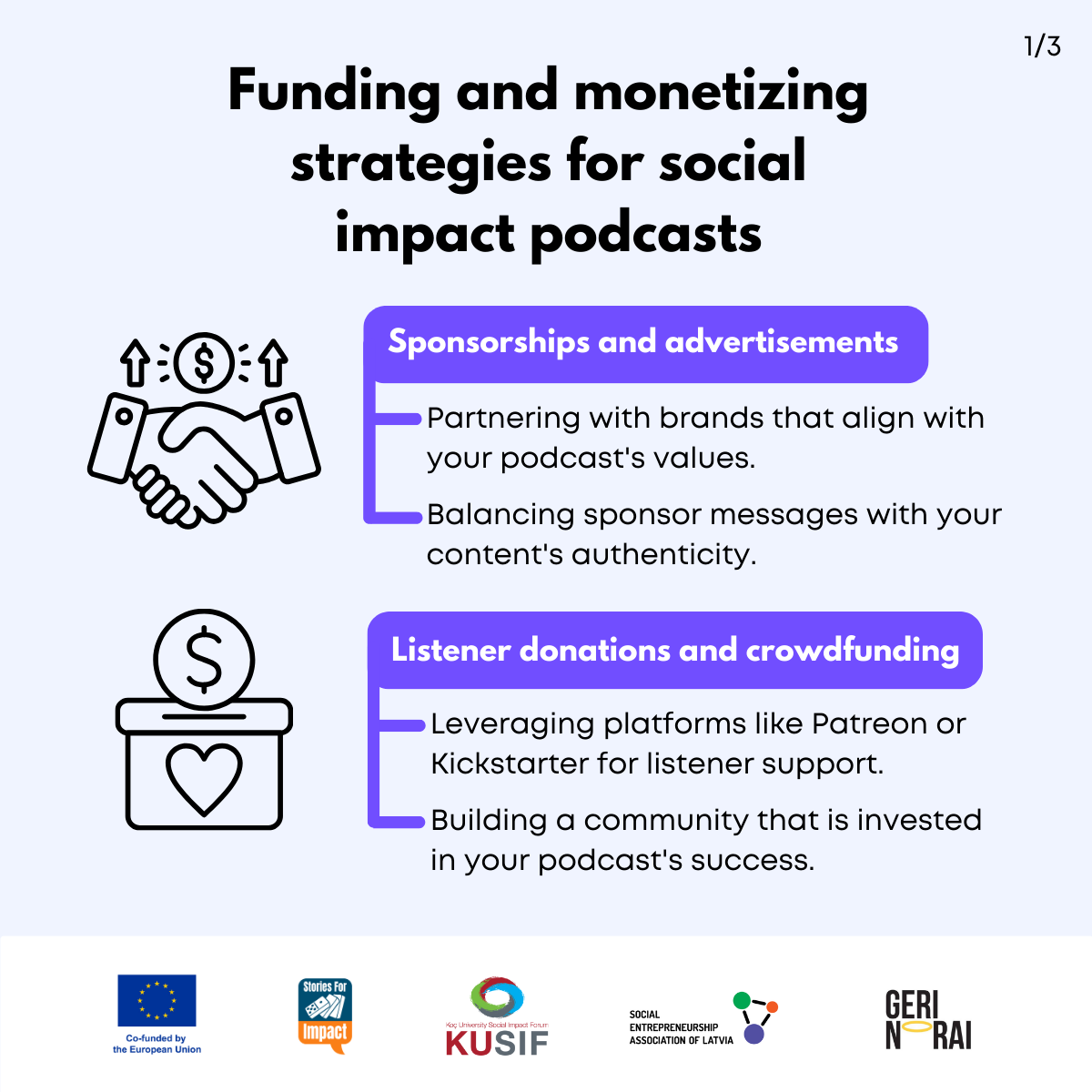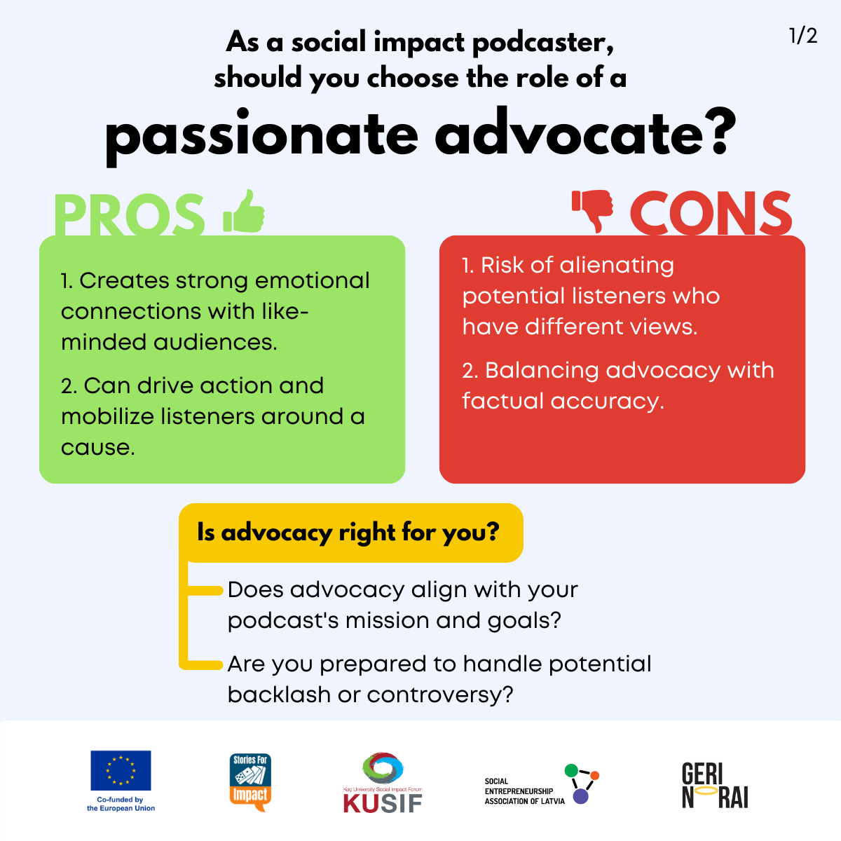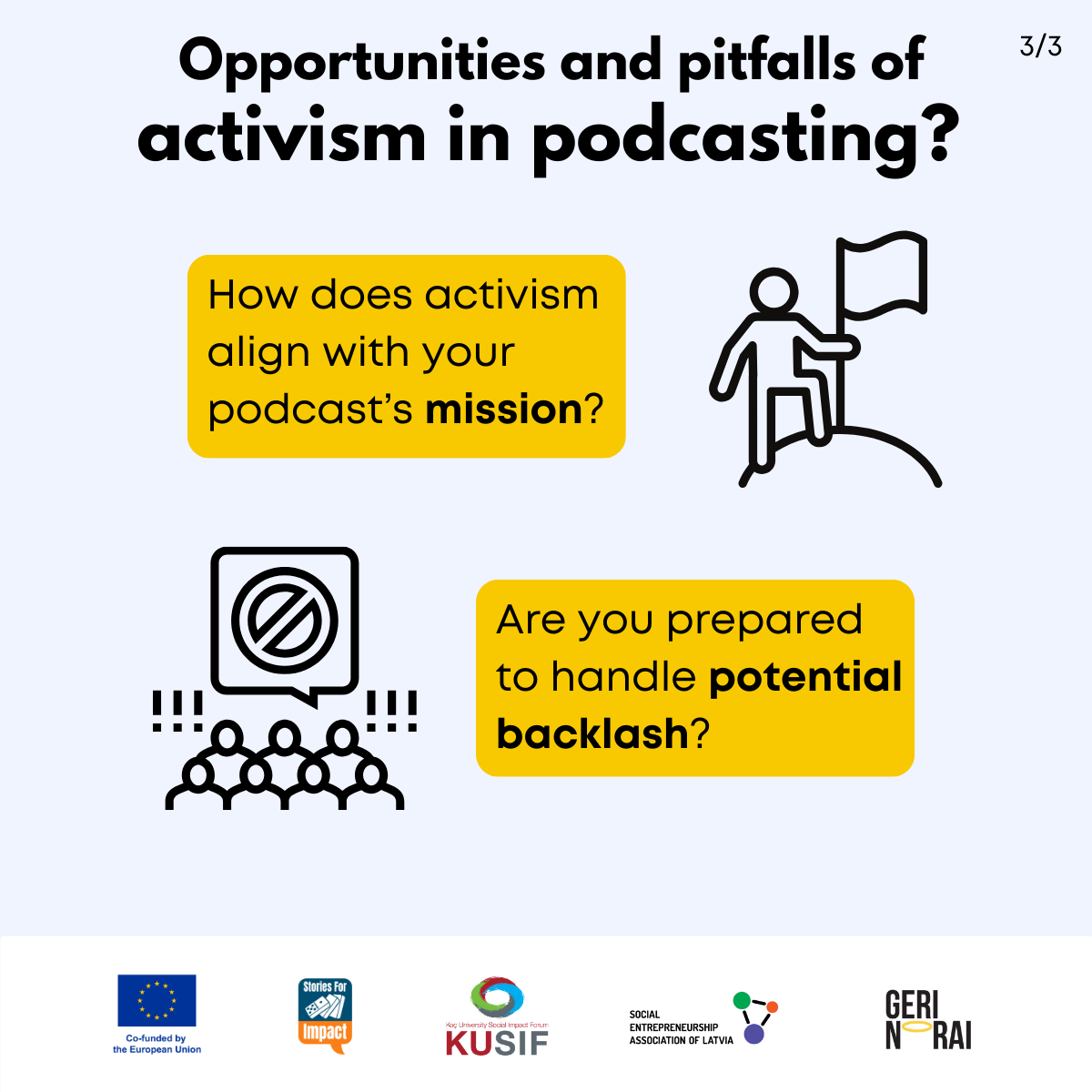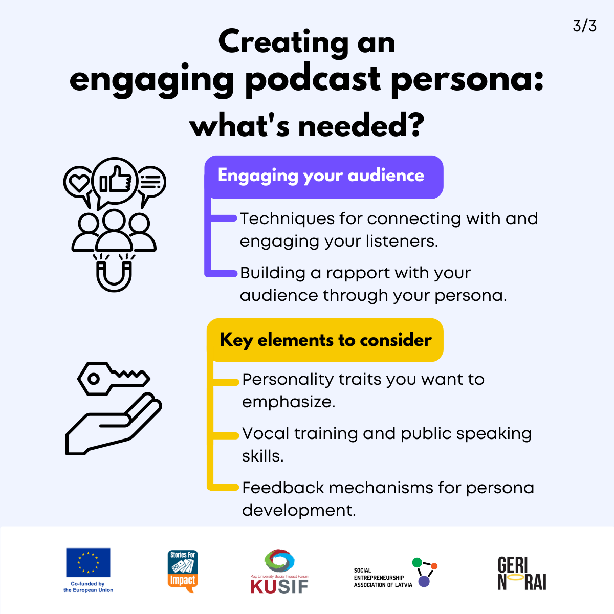 Here, we have created several visual materials with information you can use to start your own social impact podcast. You can study them and write down your thoughts, plans, etc., but to get the most out of it, we recommend you discuss them with a friend or a colleague and create at least one actionable item per studied material, as well as set a time when you’re going to execute it.
