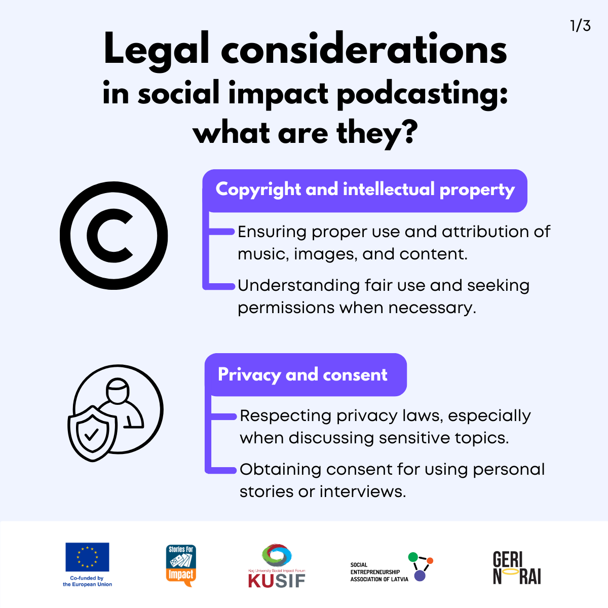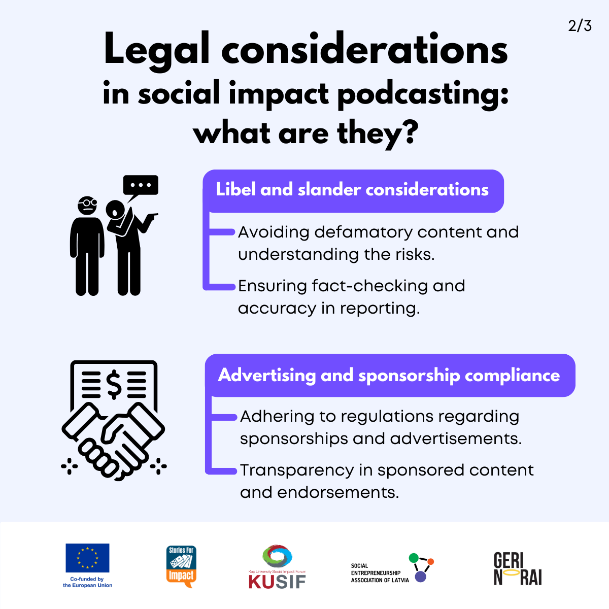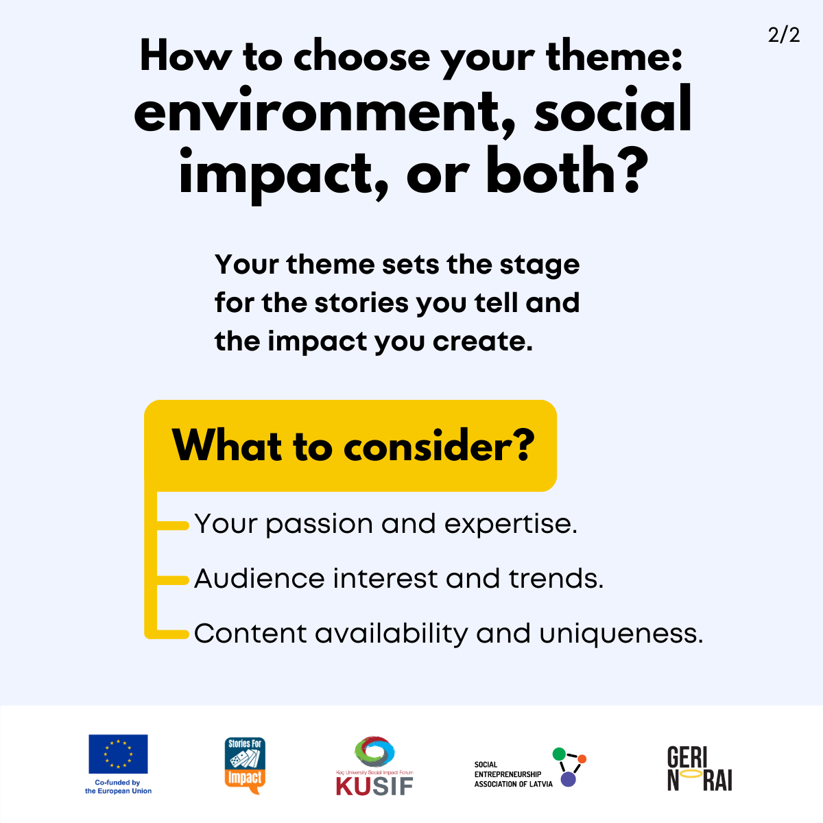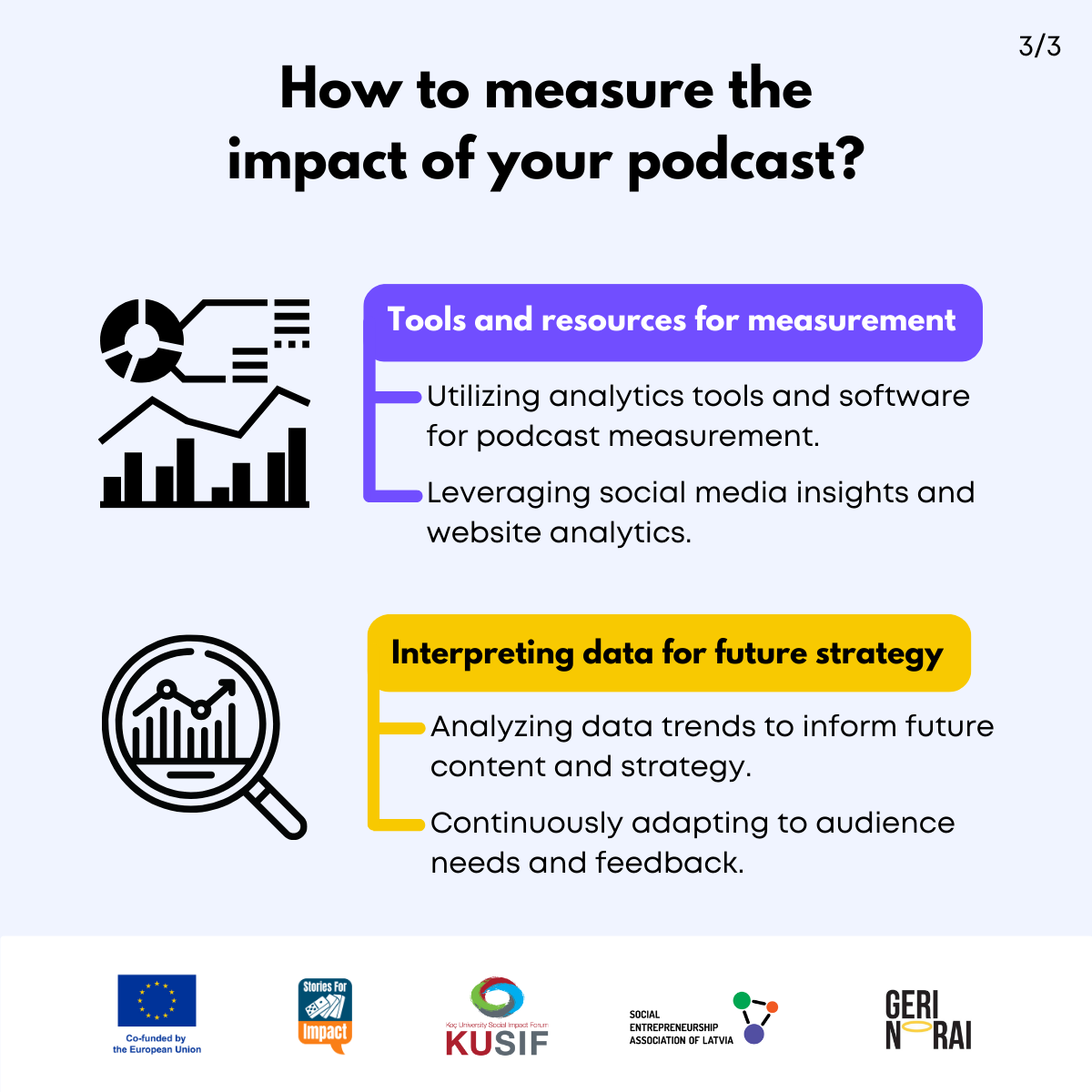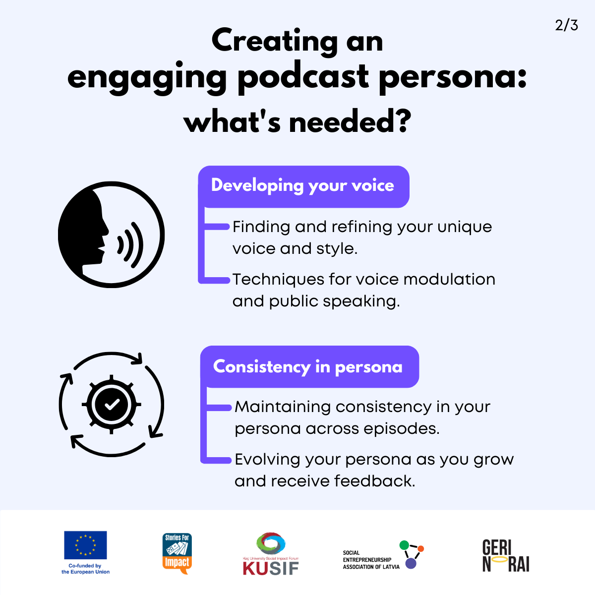 Here, we have created several visual materials with information you can use to start your own social impact podcast. You can study them and write down your thoughts, plans, etc., but to get the most out of it, we recommend you discuss them with a friend or a colleague and create at least one actionable item per studied material, as well as set a time when you’re going to execute it.