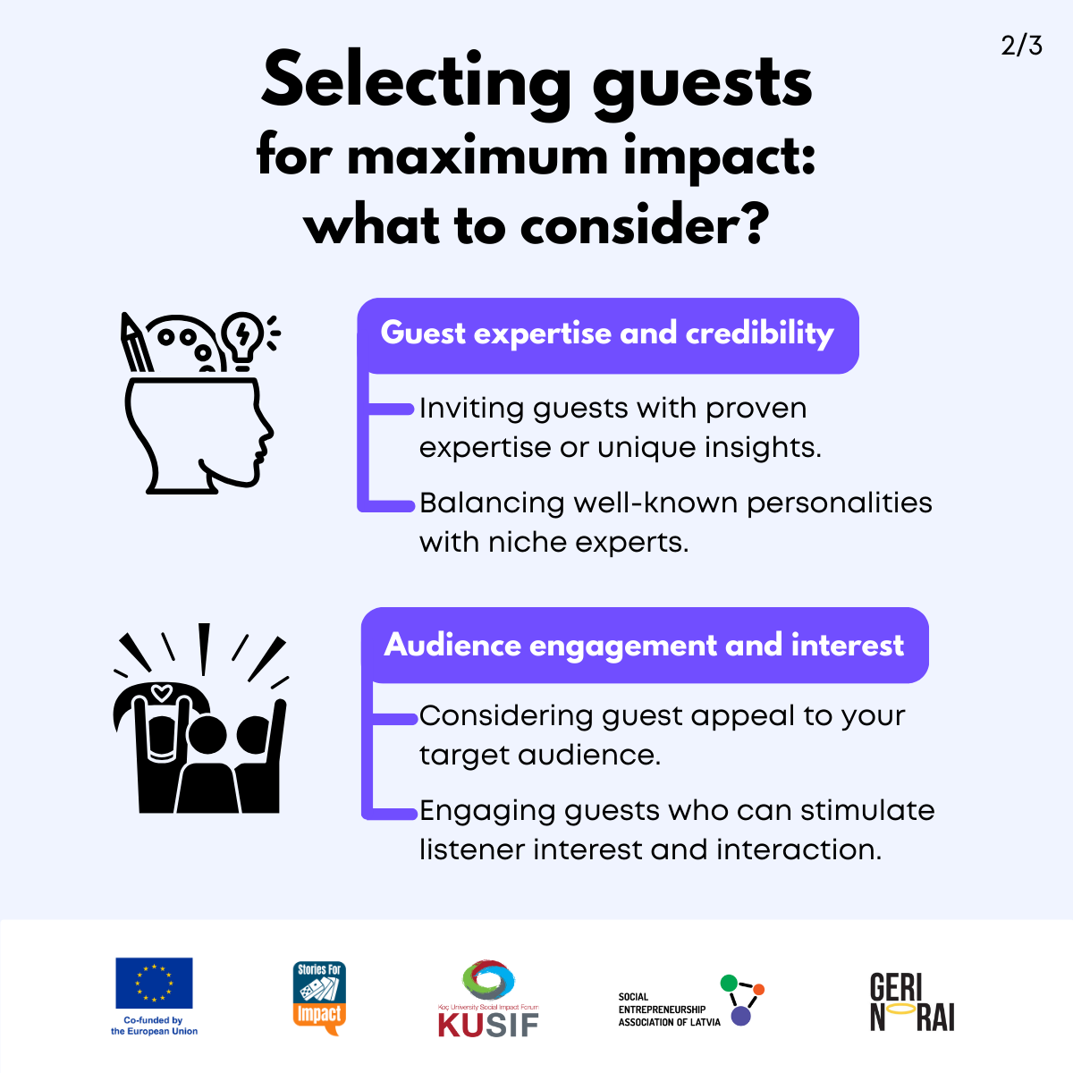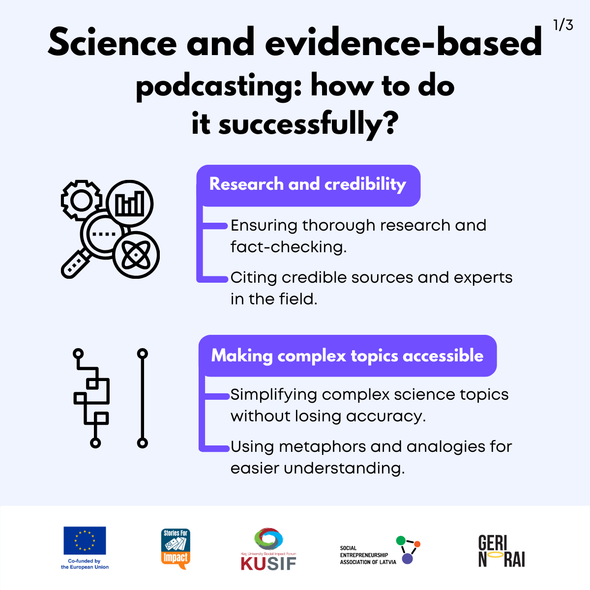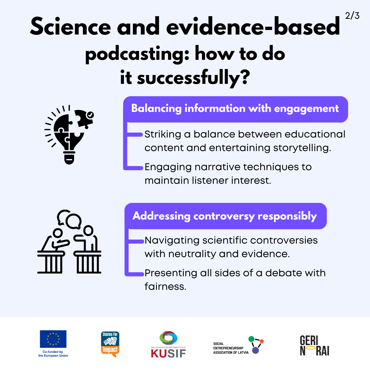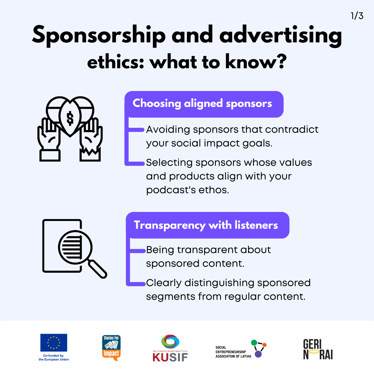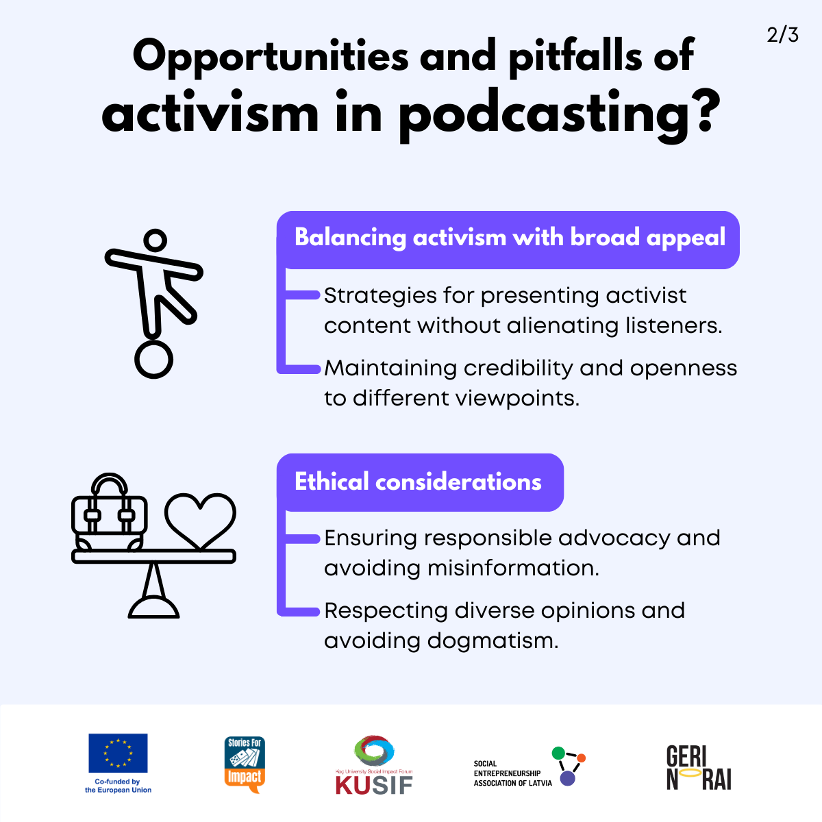 Here, we have created several visual materials with information you can use to start your own social impact podcast. You can study them and write down your thoughts, plans, etc., but to get the most out of it, we recommend you discuss them with a friend or a colleague and create at least one actionable item per studied material, as well as set a time when you’re going to execute it.