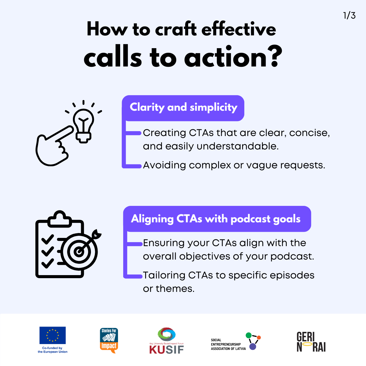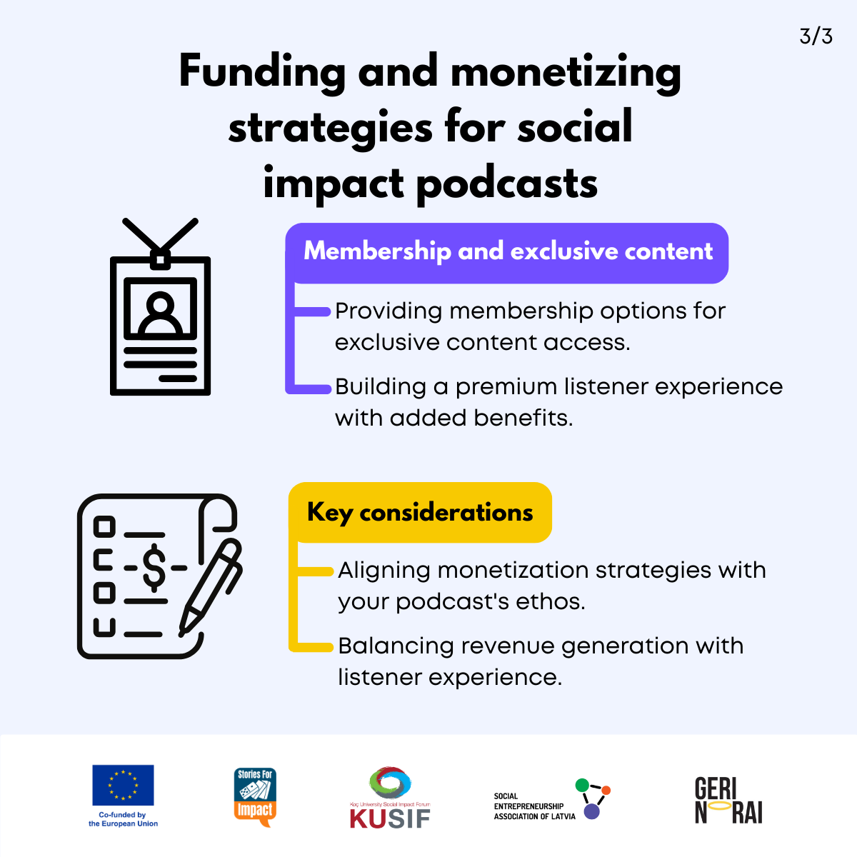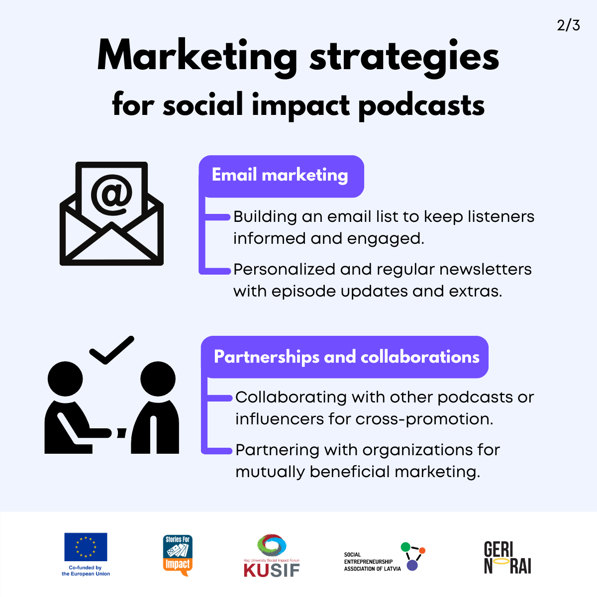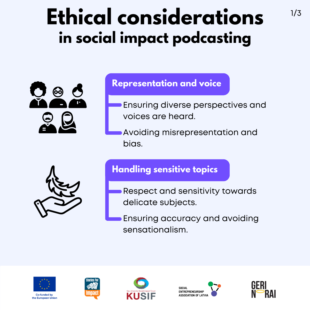 Here, we have created several visual materials with information you can use to start your own social impact podcast. You can study them and write down your thoughts, plans, etc., but to get the most out of it, we recommend you discuss them with a friend or a colleague and create at least one actionable item per studied material, as well as set a time when you’re going to execute it.