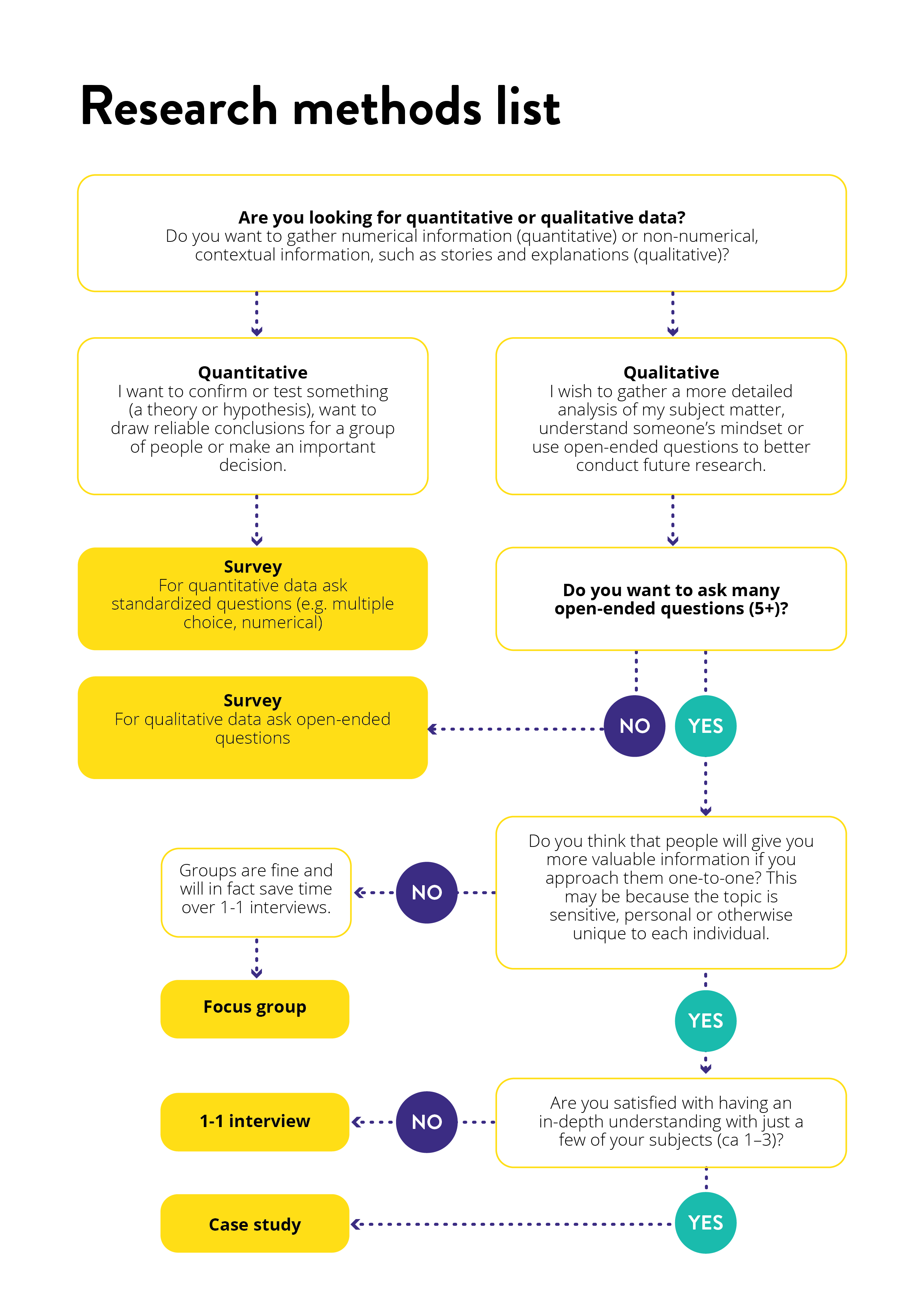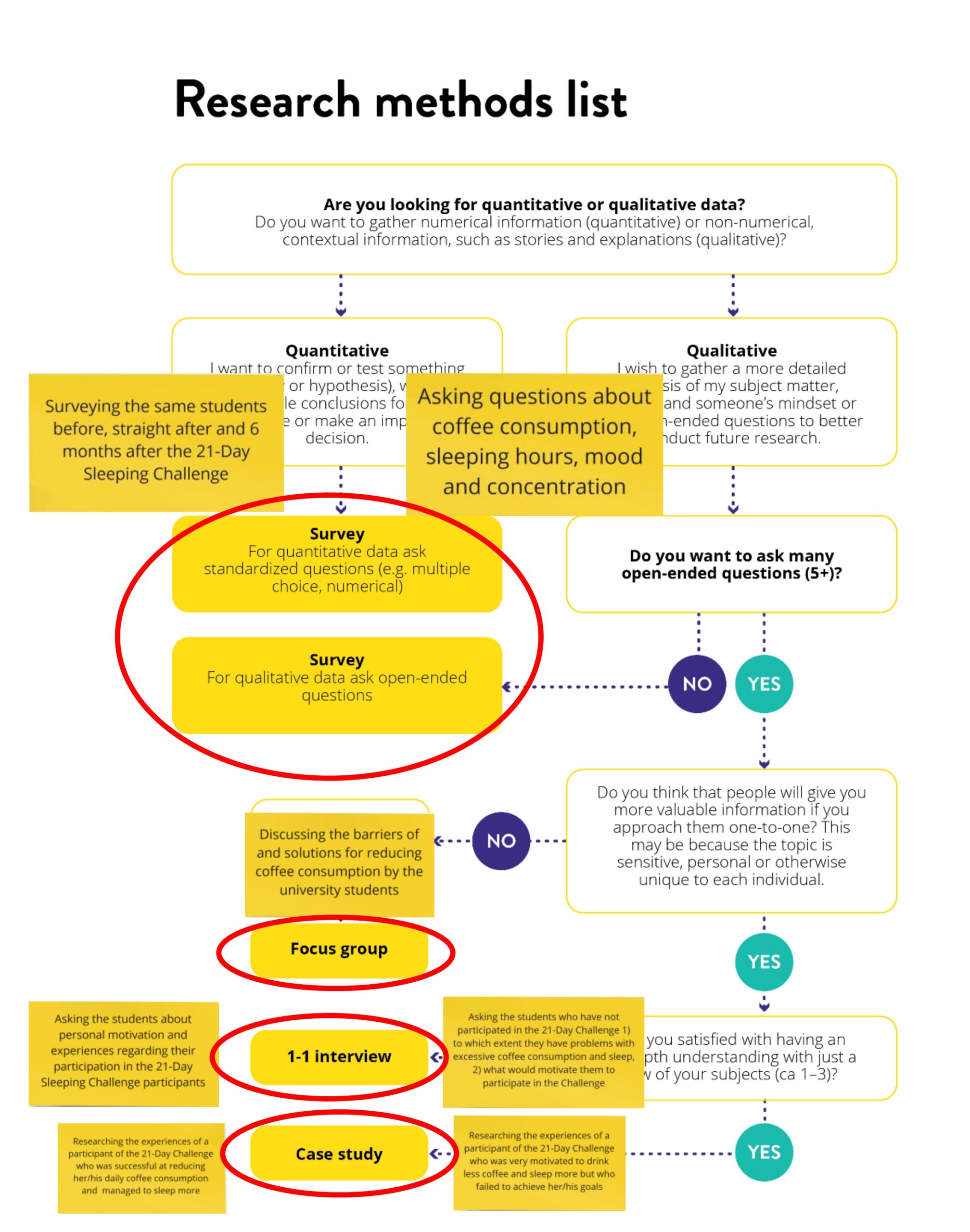 If you need additional information on any of the methods, we encourage you to look it up online! Each of the methods has its own peculiarities that you need to know about, for example, conducting a focus group needs a very skilled moderator.