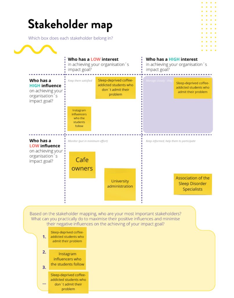 2. Brainstorm and write down all the stakeholders that are or may be important from the perspective of achieving your impact goal. Who can influence the success of your activities? Who will you influence with your activities and need to take responsibility for?